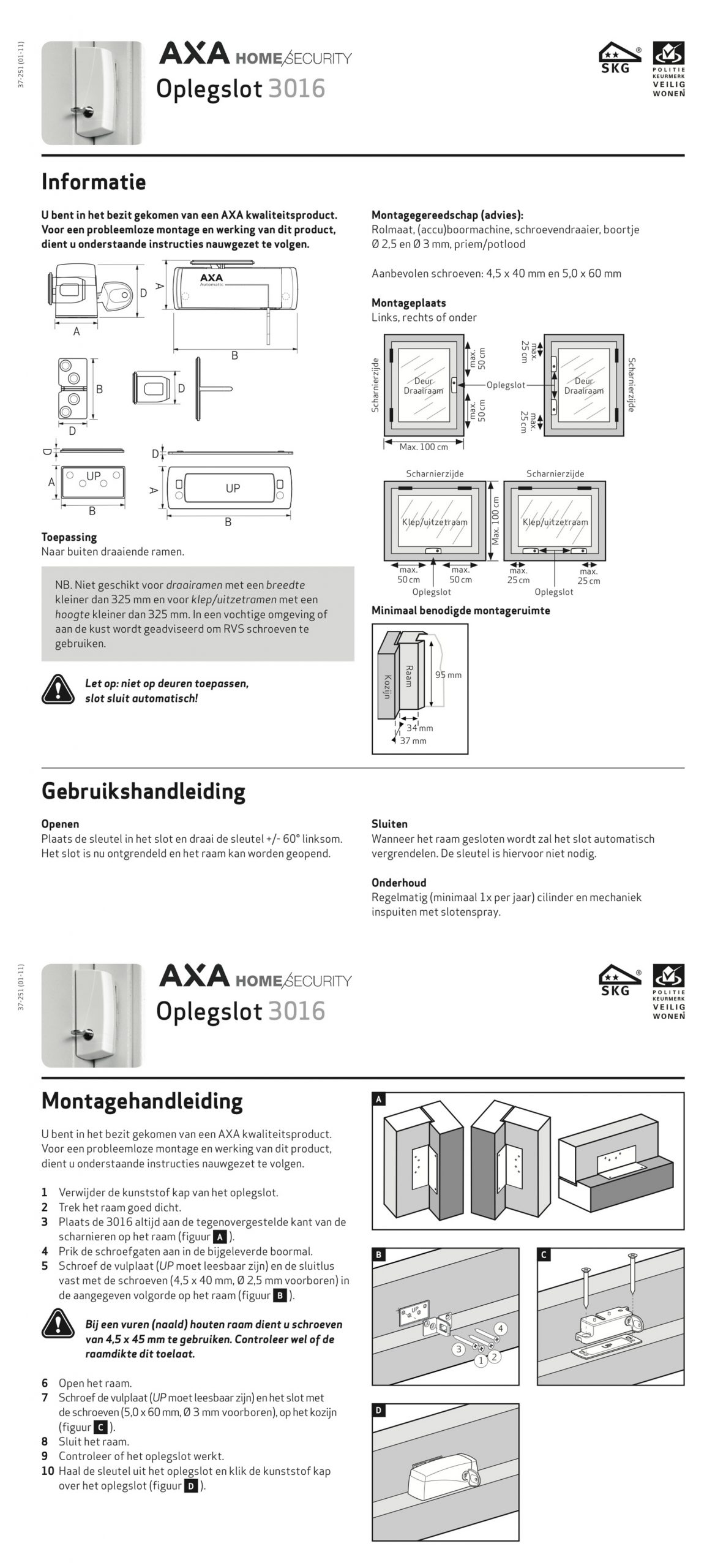 | SKG Normering SKG (Stichting Kwaliteit Gevelbouw) test en certificeert hang- en sluitwerk op inbraakwerendheid. De SKG-classificatie wordt aangeduid met sterren. Het verschil tussen SKG** en SKG*** zit in de mate van bescherming: SKG** moet in combinatie met ander beveiligingsmateriaal worden gebruikt, terwijl SKG*** op zichzelf al een hoog beveiligingsniveau biedt. SKG*** biedt 2 minuten extra inbraakvertraging ten opzichte van SKG**. | |