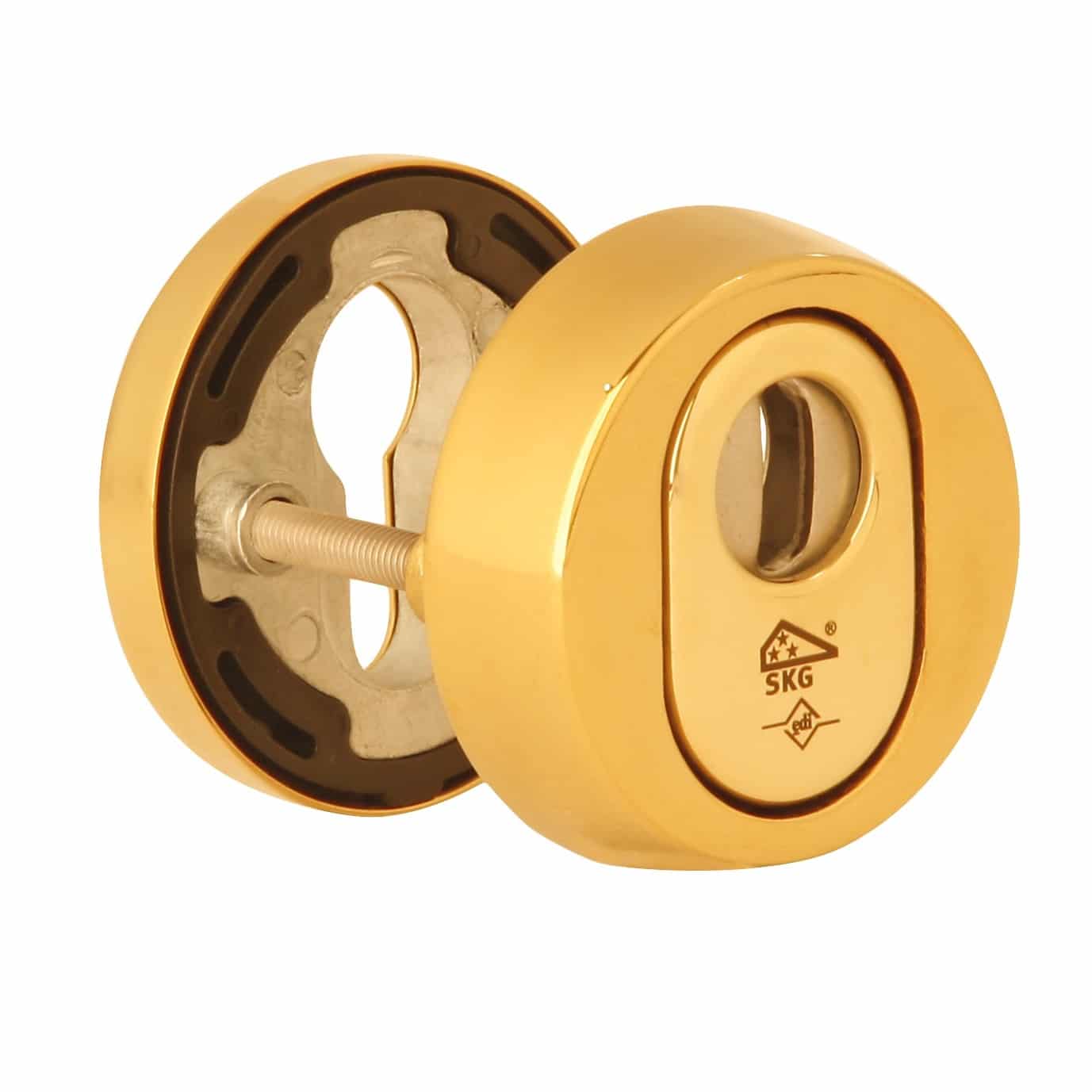 Dit veiligheidsbeslag Dieckmann Rond van RVS Messing gepolijst PVD met kerntrek beveiliging heedft een diameter van 55 mm. Het buiten rozet is 15 mm dik en het binnen rozet is 8 mm dik. Dit rozet is standaard geschikt voor deurdikten van 35 tot 65 mm en heeft een blinde bevestiging
