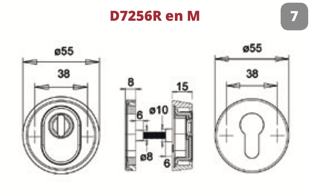 Dit veiligheidsbeslag Dieckmann Rond van RVS mat geborsteld met kerntrek beveiliging heeft een diameter van 55 mm. Het buiten rozet is 15 mm dik en het binnen rozet is 8 mm dik. Dit rozet is standaard geschikt voor deurdikten van 35 tot 65 mm en heeft een blinde bevestiging