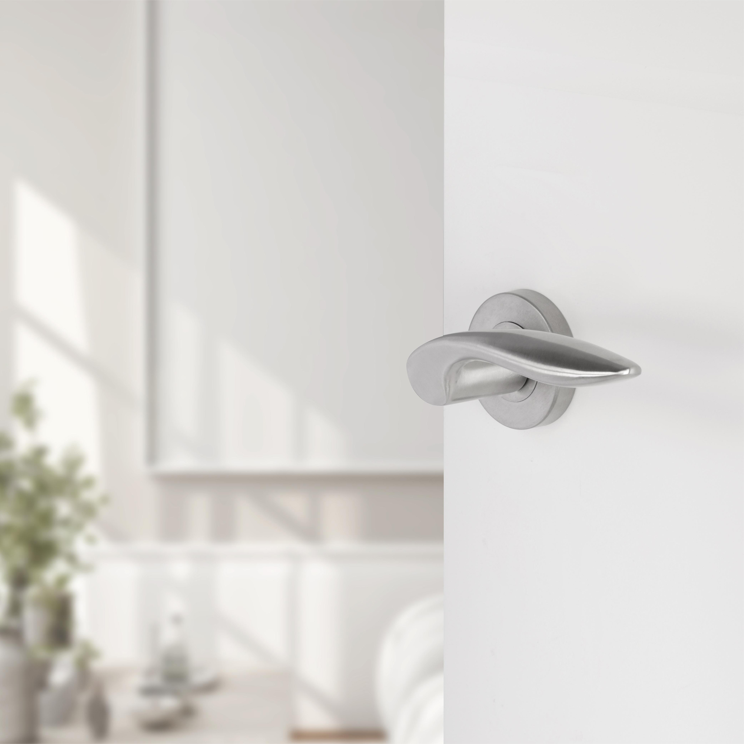 Voeg stijl en functionaliteit toe aan je interieur met deze gebogen deurkruk op rond rozet uit de populaire Differnz Groningen-serie. De set is uitgevoerd in mat chroom, een trendy en tijdloze kleur die perfect past in zowel moderne als klassieke interieurs.