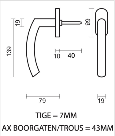 De raamkruk wordt geleverd met bevestigingsmaterialen en een stift van 7x7x40 mm. De bevestigingsgaten hebben een afstand van 43 mm.