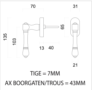 De raamkruk wordt geleverd met bevestigingsmaterialen en een stift van 7x7x40 mm. De bevestigingsgaten hebben een afstand van 43 mm.
