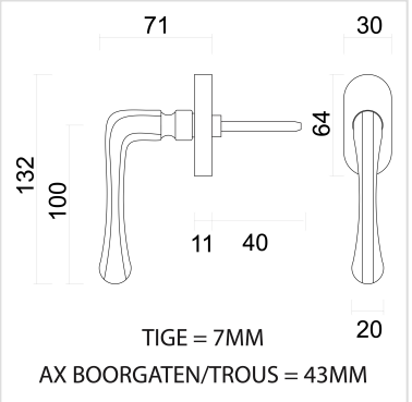 De raamkruk wordt geleverd met bevestigingsmaterialen en een stift van 7x7x40 mm. De bevestigingsgaten hebben een afstand van 43 mm.