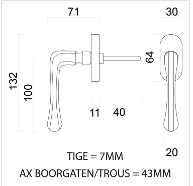 De raamkruk wordt geleverd met bevestigingsmaterialen en een stift van 7x7x40 mm. De bevestigingsgaten hebben een afstand van 43 mm.