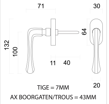 De raamkruk wordt geleverd met bevestigingsmaterialen en een stift van 7x7x40 mm. De bevestigingsgaten hebben een afstand van 43 mm.