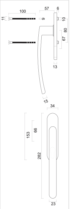 De raamkruk wordt geleverd met bevestigingsmaterialen en een stift van 8x8x40 mm. De bevestigingsgaten hebben een afstand van 43 mm.