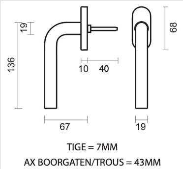 De raamkruk wordt geleverd met bevestigingsmaterialen en een stift van 7x7x40 mm. De bevestigingsgaten hebben een afstand van 43 mm.