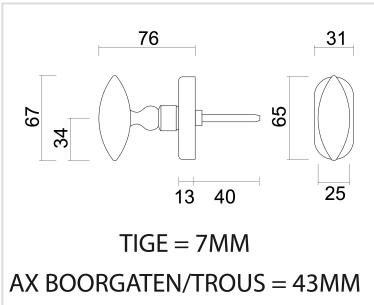 De raamkruk wordt geleverd met bevestigingsmaterialen en een stift van 7x7x40 mm. De bevestigingsgaten hebben een afstand van 43 mm.