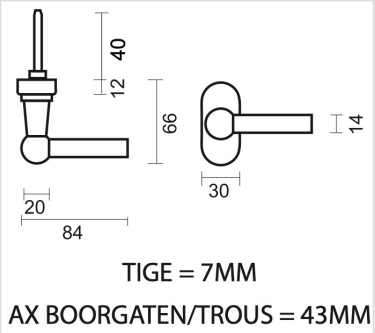 De raamkruk wordt geleverd met bevestigingsmaterialen en een stift van 7x7x40 mm. De bevestigingsgaten hebben een afstand van 43 mm.