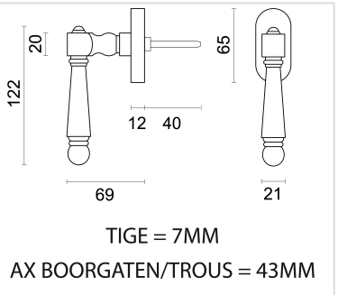 De raamkruk wordt geleverd met bevestigingsmaterialen en een stift van 7x7x40 mm. De bevestigingsgaten hebben een afstand van 43 mm.