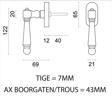 De raamkruk wordt geleverd met bevestigingsmaterialen en een stift van 7x7x40 mm. De bevestigingsgaten hebben een afstand van 43 mm.
