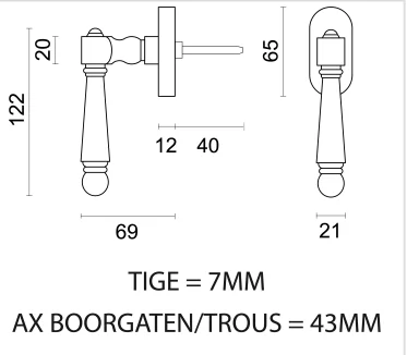 De raamkruk wordt geleverd met bevestigingsmaterialen en een stift van 7x7x40 mm. De bevestigingsgaten hebben een afstand van 43 mm.