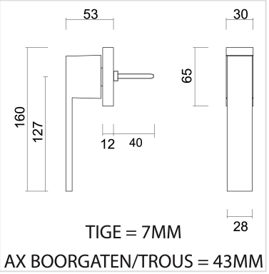 De raamkruk wordt geleverd met bevestigingsmaterialen en een stift van 7x7x40 mm. De bevestigingsgaten hebben een afstand van 43 mm.