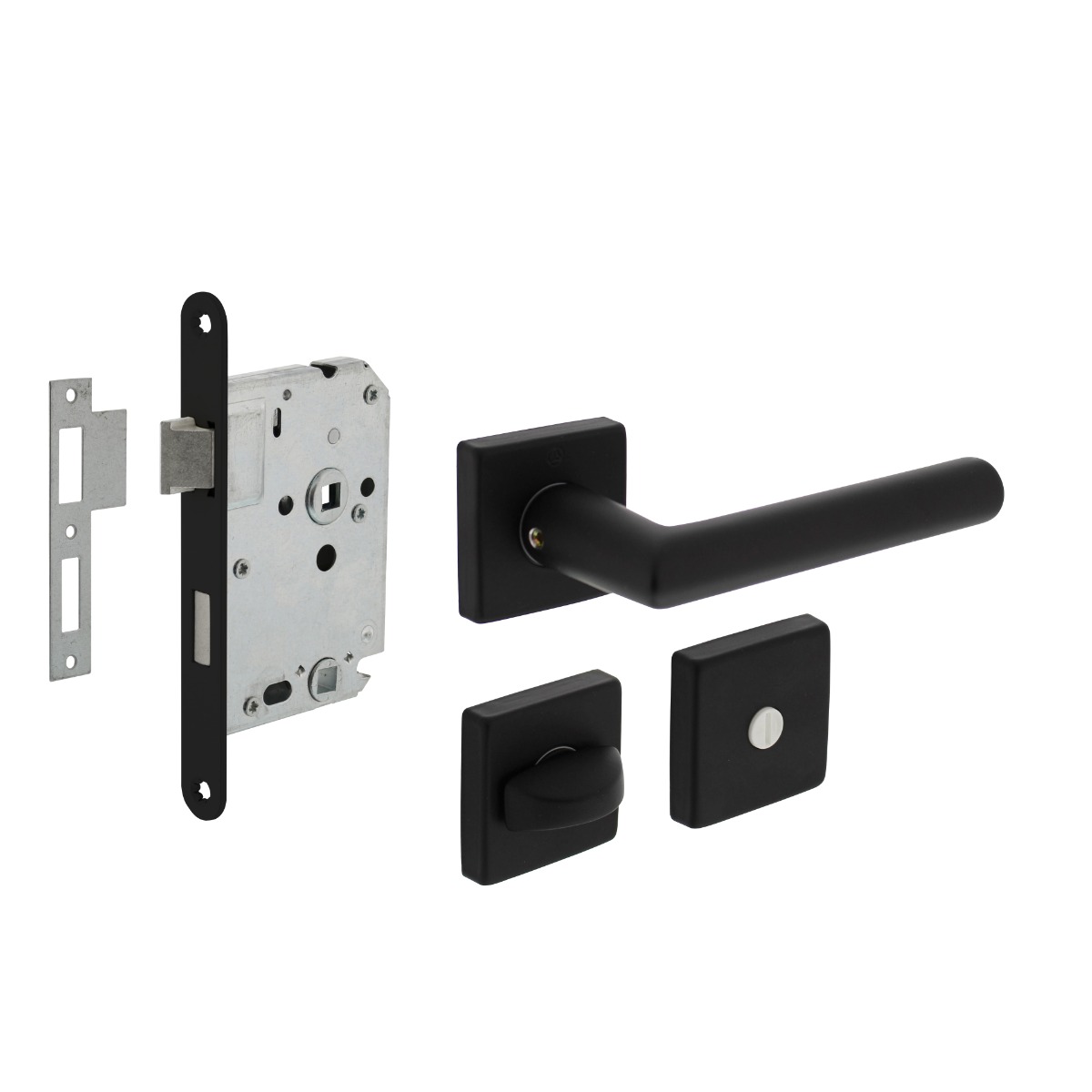 Deze deurbeslag set toiletslot zwart voor toilet-/badkamerdeuren bestaat uit een wc-slot met een bijpassende deurkruk en wc-sluiting. Het slot wordt geleverd in toilet-/badkamer uitvoering op 63 mm en met een 8 mm stift. De doornmaat van dit slot is 50 mm en wordt geleverd inclusief sluitplaat en een zwarte afgeronde voorplaat. U kunt dezelfde inbouw- en freesmaten gebruiken als een standaard woningslot. De dagschoot van dit slot is omwisselbaar. Dat wil zeggen dat deze voor zowel naar linksdraaiende als rechtsdraaiende deuren geschikt is. Deurkruk Broome op vierkant rozet is vervaardigd uit Aluminium en is naderhand van een zwarte coating voorzien. De rozet heeft een kunststof onderconstructie en is voorzien van een veer, die ervoor zorgt dat de kruk na gebruik weer terugveert naar zijn originele horizontale positie. Deze deurkruk is geschikt voor een deurdikte van 38 – 42 mm en wordt per paar geleverd inclusief bijpassende wc-sluiting en bevestigingsmateriaal.