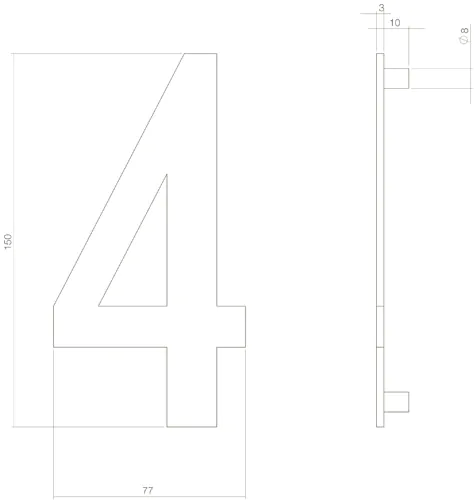 Roestvast stalen huisnummer 4 in een mat zwarte uitvoering. Een lange levensduur door het gebruik van massief rvs. Dit huisnummer heeft een hoogte van 150 mm en een dikte van 3 mm. Montage is eenvoudig door het bijgeleverde bevestigingsmateriaal.
