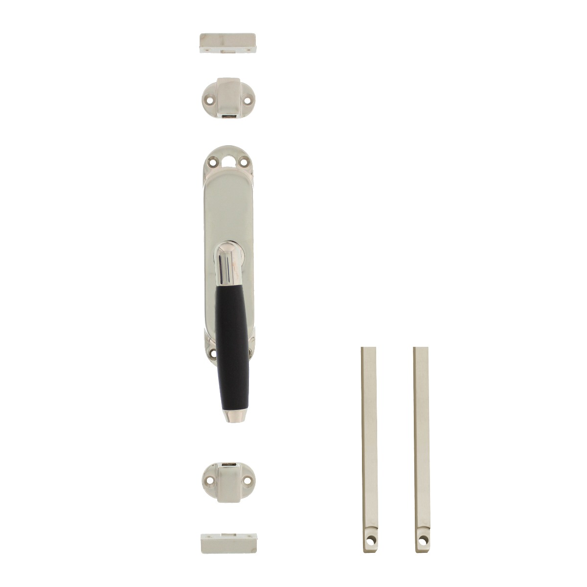 De Intersteel | Kruk-espagnolet | Rechts Ton 400 met stangenset 2x1250mm | Nikkel/ebbenhout biedt zowel praktische functionaliteit als een elegante esthetiek voor het beveiligen van deuren en ramen. Met één simpele handeling kunt u zowel de boven- als onderzijde van een deur of raam vergrendelen. Het klassieke ontwerp van de Ton 400 espagnolet voegt een verfijnde uitstraling toe aan uw woning of gebouw.