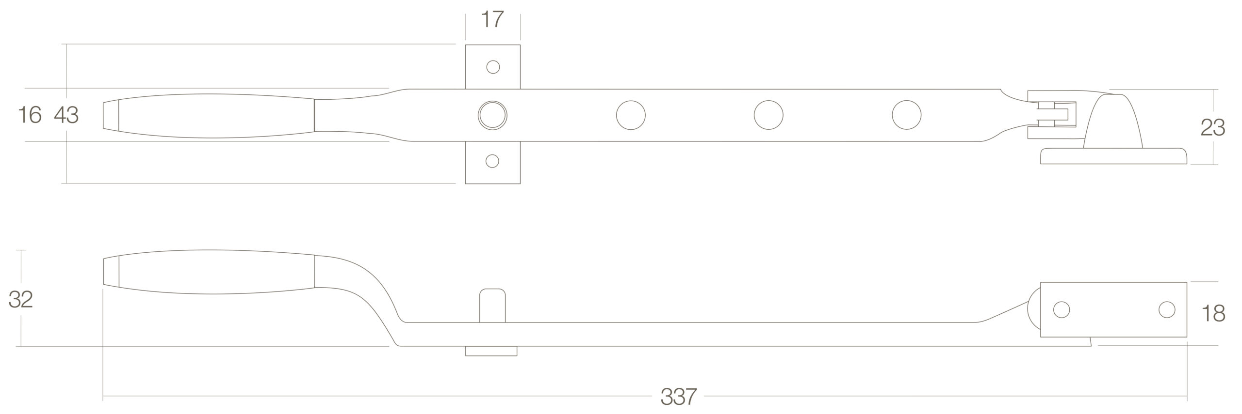 Deze raamuitzetter van ongelakt messing biedt een klassieke uitstraling en is voorzien van een penbevestiging. Ideaal voor verschillende raamtypes.