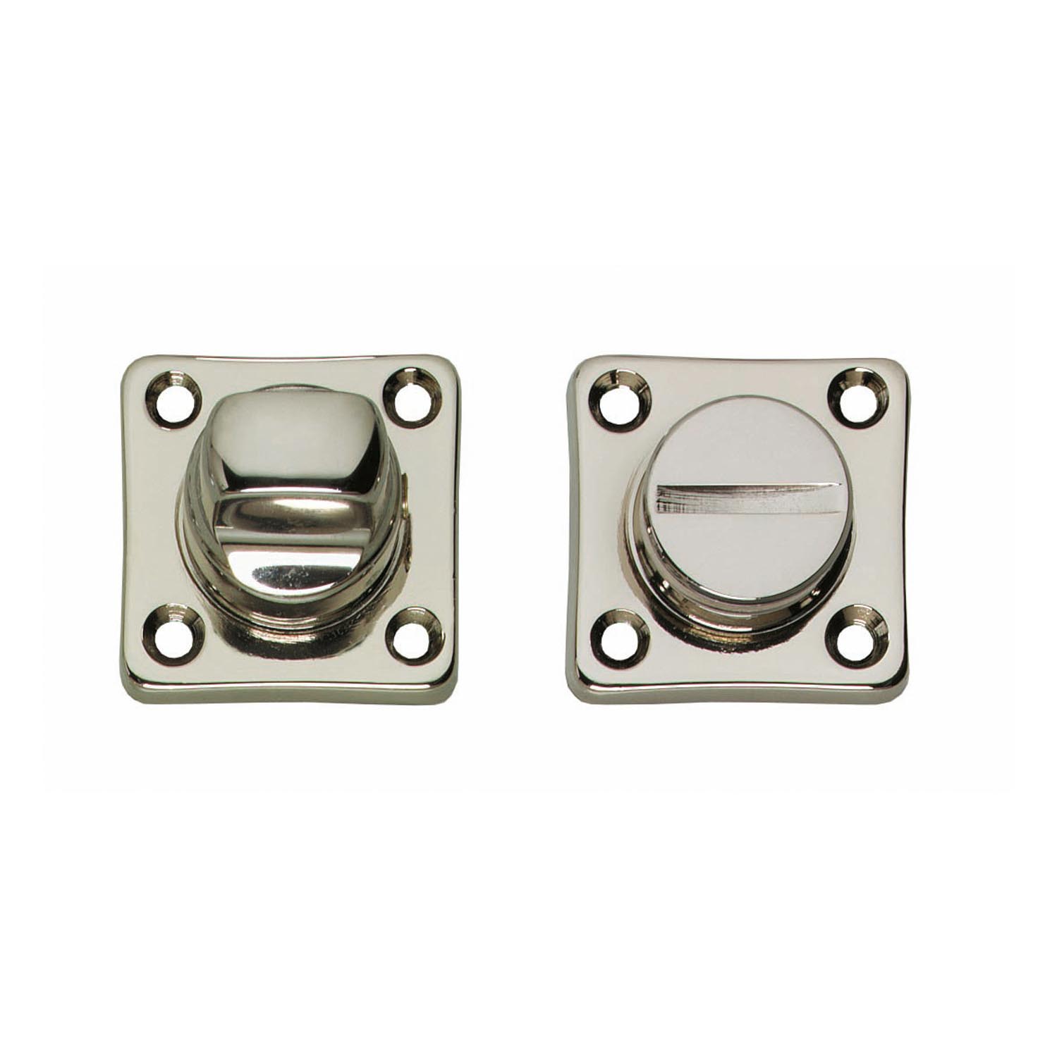 Deze toilet-/badkamersluiting is uitgevoerd in glanzend nikkel en heeft een vierkant ontwerp.