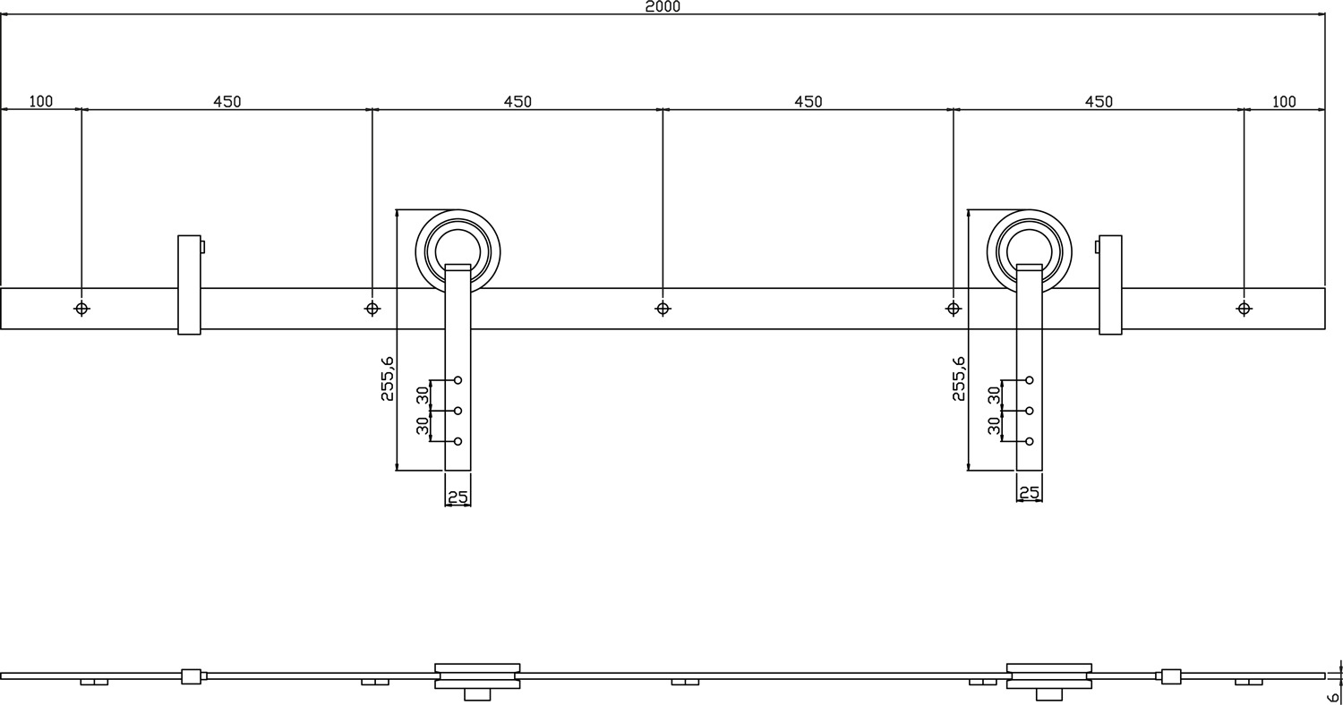 Twee roestvast stalen rails van 100 cm ,Twee gelagerde roestvast stalen hangers ,Twee roestvast stalen deurstoppers ,Twee afstandhouder voor op de deur ,Schuifdeur vloergeleider ,Bevestigingsmateriaal |