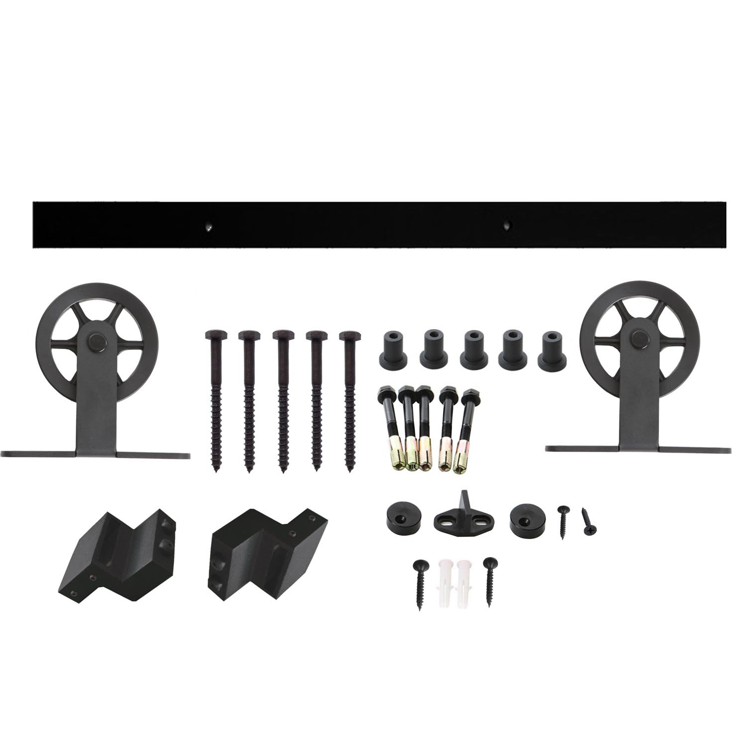 Twee stalen rails van 100 cm ,Twee gelagerde stalen hangers ,Twee stalen deurstoppers ,Twee afstandhouder voor op de deur ,Schuifdeur vloergeleider ,Bevestigingsmateriaal |