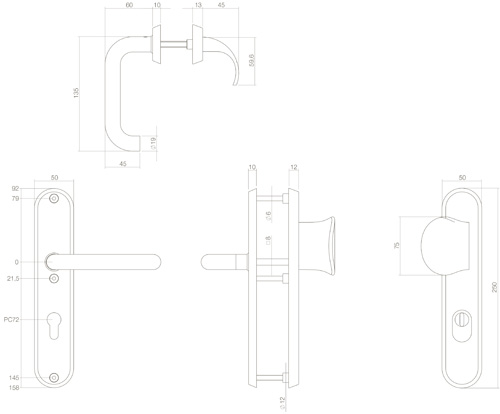 Specificaties Intersteel | Veiligheidsbeslag geveerd greep/kruk met kerntrekbeveiliging | SKG3 | PC72mm | Rechthoekig | Voordeurbeslag | Aluminium Zwart