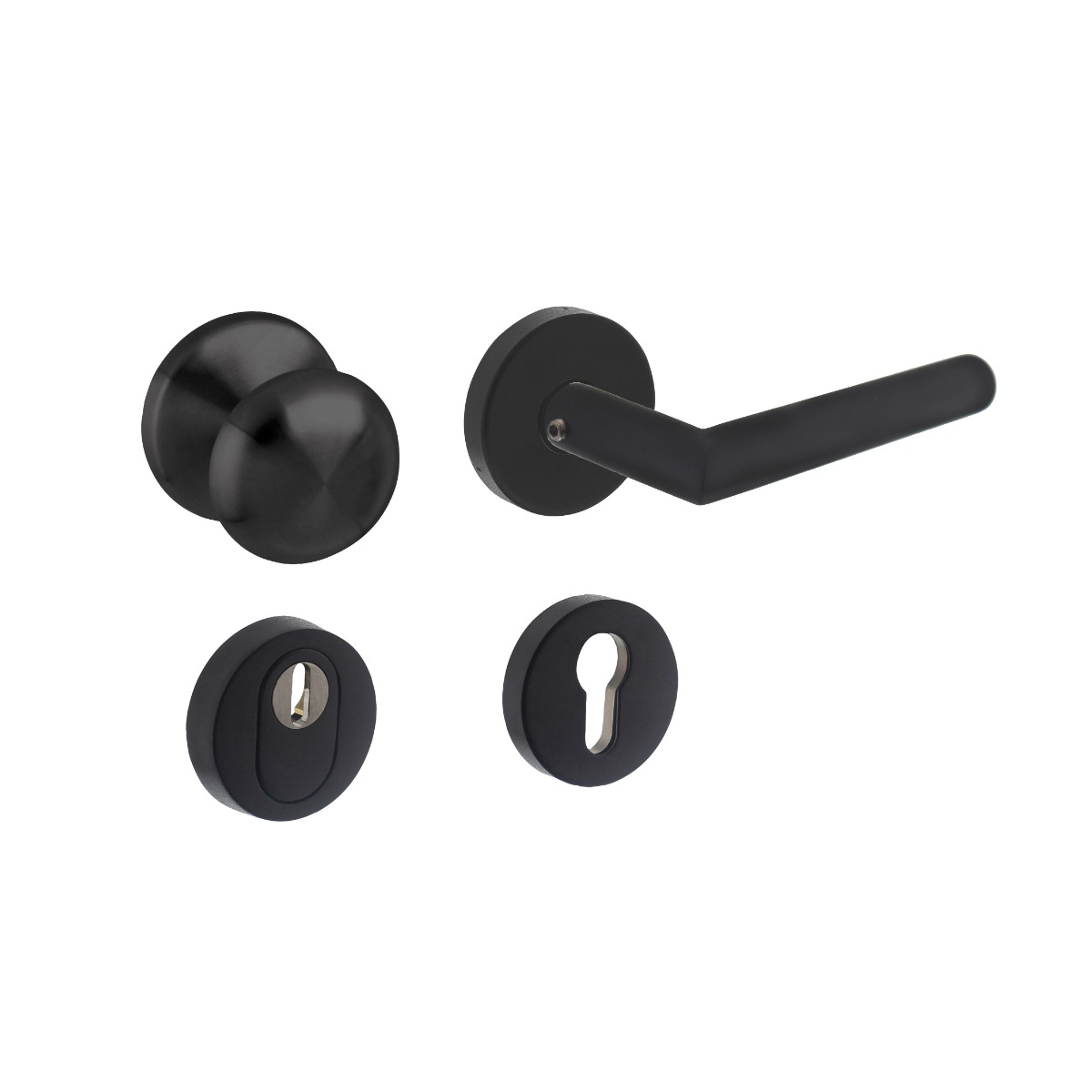 Deze basis set Intersteel Voordeurset veiligheidsbeslag SKG*** is uitgevoerd in rvs en voorzien van een zwarte coating. De set bestaat uit een deurkruk op rozet, een voordeurknop, veiligheidsrozetten met kerntrekbeveiliging en SKG*** keurmerk. Het voordeurbeslag is sterk, duurzaam en van een hoge kwaliteit. Deze set wordt geleverd inclusief bevestigingsmateriaal.