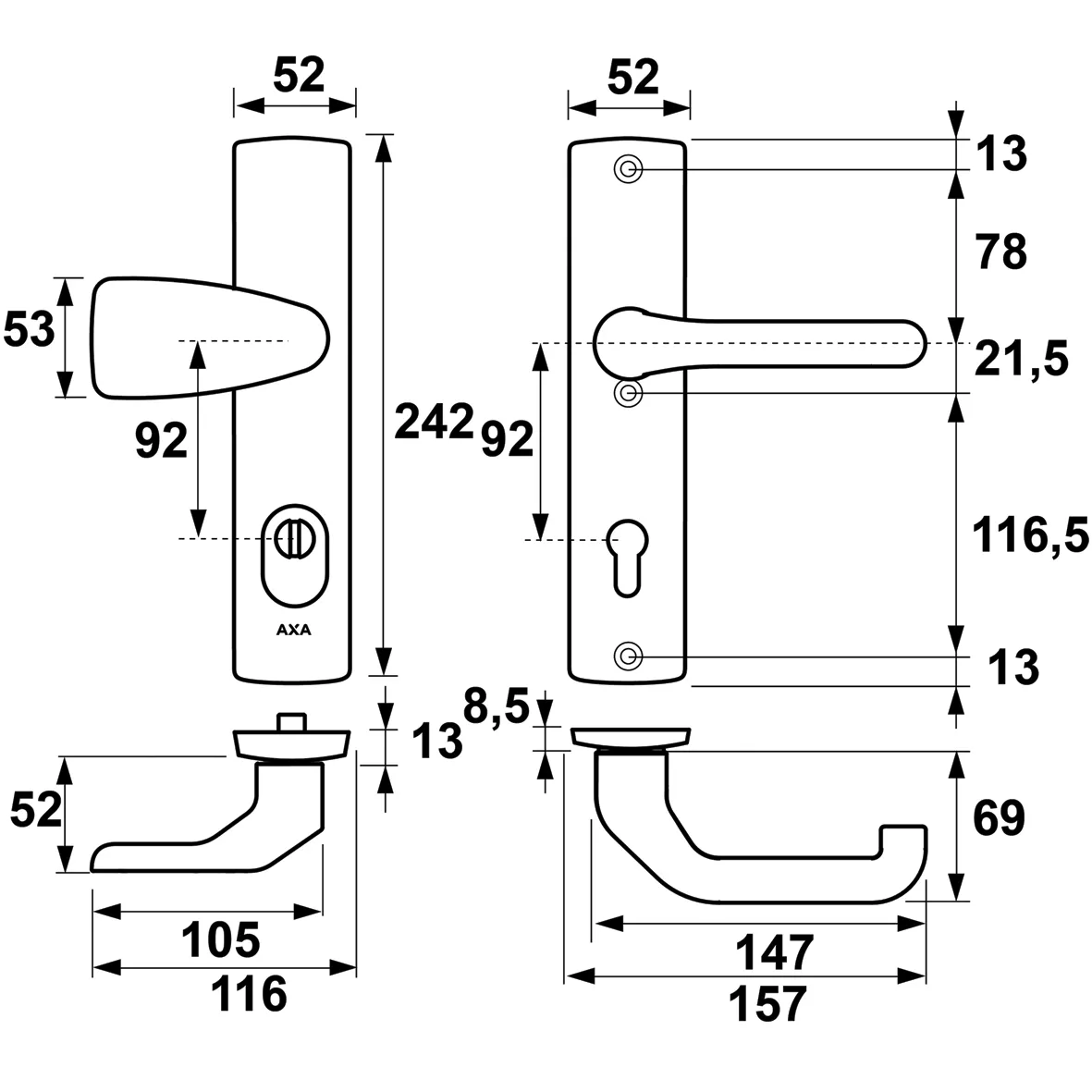 • Compatibiliteit: Geschikt voor deuren van 38 tot 67 mm dik, met mogelijkheid voor aanpassing bij dikkere deuren via verlengde krukstiften en bouten.